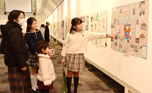 会場には受賞者が家族と共に訪れ、作品をじっくりと鑑賞したり、記念写真を撮ったりしていた。小学校4年生以下の部で、大阪・関西万博をテーマにした作品が佳作に選ばれた太田芽羽さん(秋大付小4年)は「万博に行って楽しかったので、その魅力が伝わるように心がけた。他の入賞作を参考にしながら、来年もまた挑戦したい」と語った。